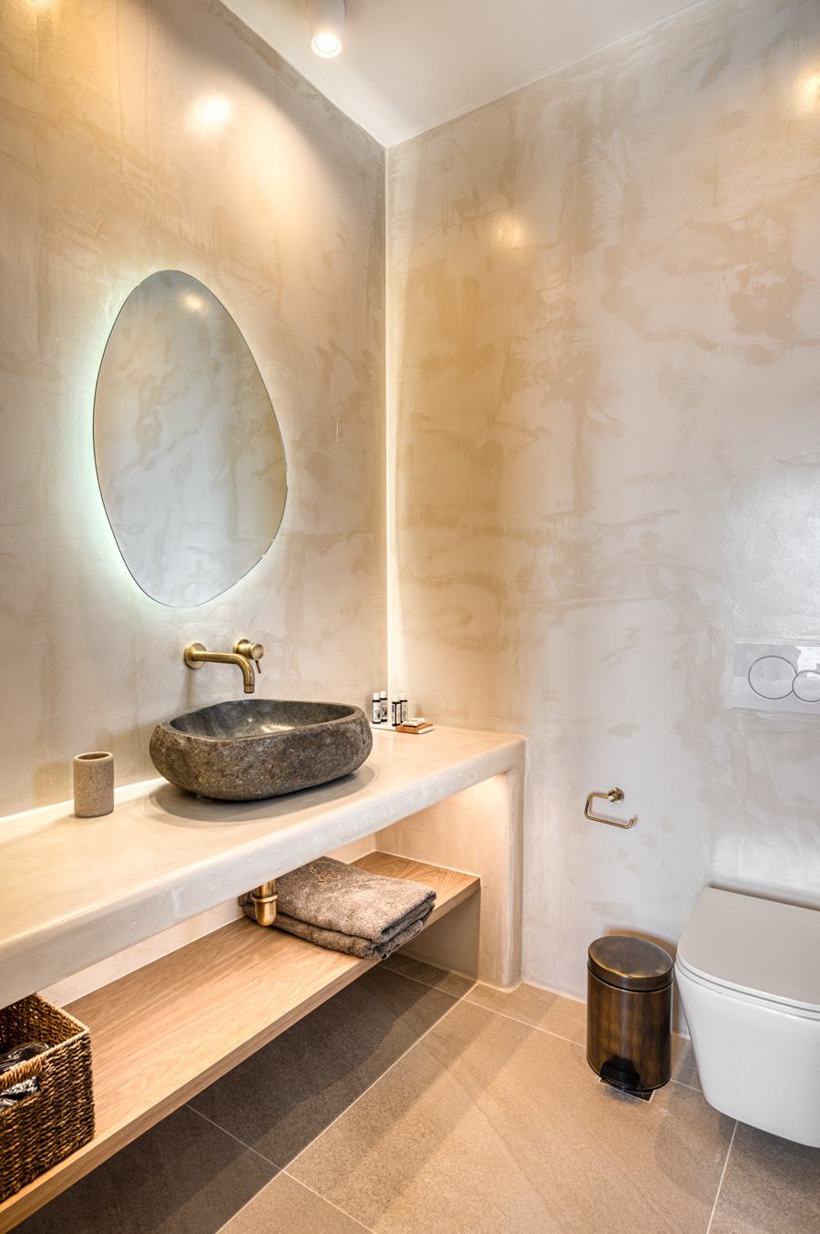 Στο εσωτερικό των δωματίων, τα χρώματα που επιλέγονται αναδεικνύουν τους απαλούς, γήινους και μεσογειακούς τόνους που χαρακτηρίζουν τη γεωμορφολογία του νησιού, και των Κυκλαδων .
